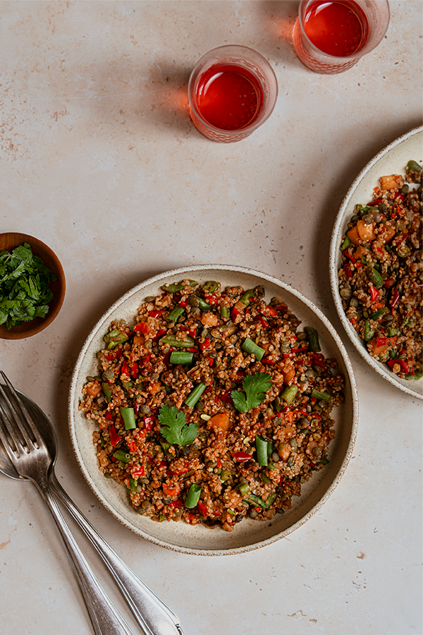 Instant green lentils, quinoa, and vibrant vegetables coated in a rich, warming chilli sauce. We’ve combined beautifully soft quinoa and green lentils with crisp vegetables, all in a deeply savoury, gently spiced chilli blend. Finished with umami-rich nutritional yeast, this is a deeply satisfying, plant-based bowl that delivers a comforting kick of flavour without upsetting your digestion.