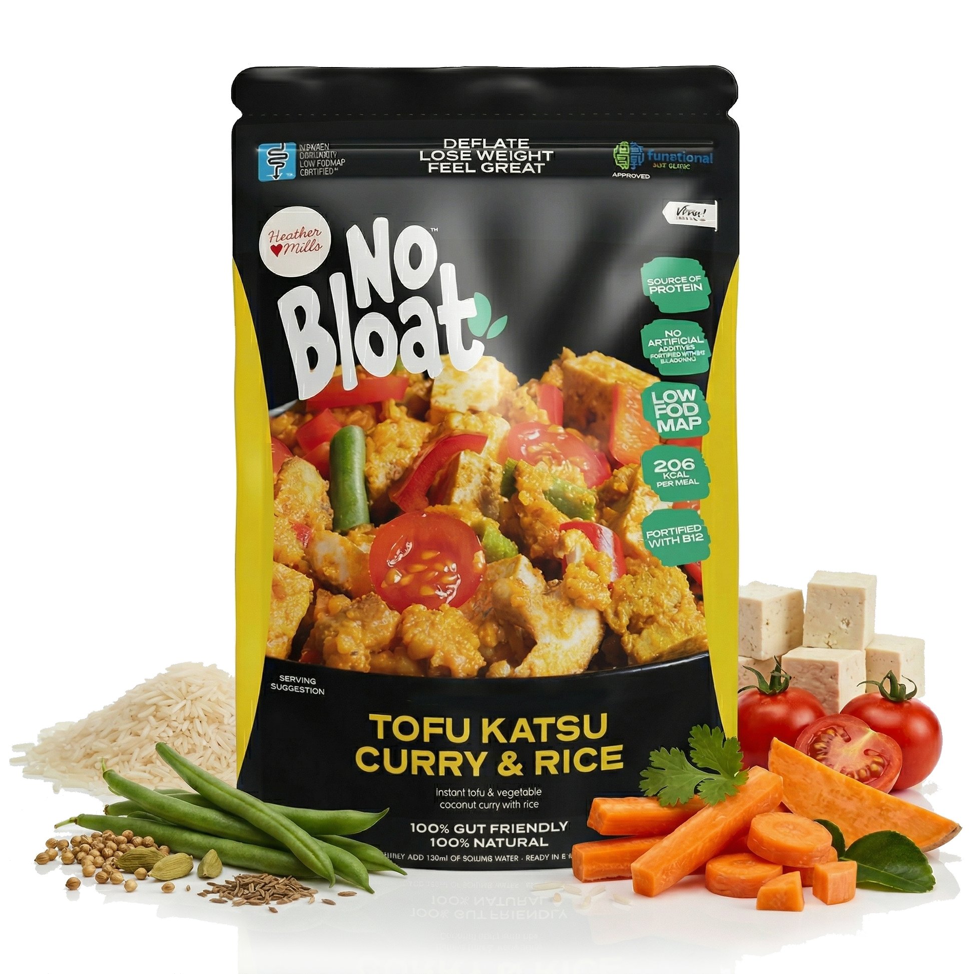 These meals are rigorously tested and safe for sensitive digestions. We use premium, 100% plant-based pulses, grains, and vegetables that are freeze-dried to lock in up to 97% of their natural nutritional value. Just add hot water, and in 8 minutes, you can enjoy fluffy rice, tofu pieces, and crisp vegetables perfectly bathed in a rich coconut katsu curry sauce.